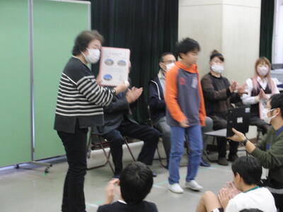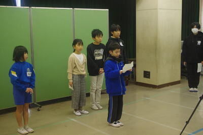 はじめに、夏休みから2学期にかけてたくさんの作品応募があり、それらに出品した子どもたちの表彰を行いました。この日は、11月に行った校内読書月間にちなんで、読書マラソン、読書感想文、図書館の本を使って調べるコンクールの表彰をしました。