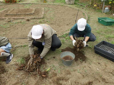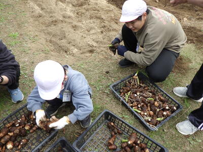 なかよし学級の子どもたちが畑ボランティアさんとサトイモ掘りをしました。大きな葉っぱ、太い茎の下には、大きなかたまりが・・・。よく見ると中くらいのサトイモと小さいサトイモが付いています。子イモ、孫イモはかたまりをひっくり返してストンと落すと簡単に取れました。土を洗い流して、かごで乾かしています。試食が楽しみです。