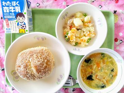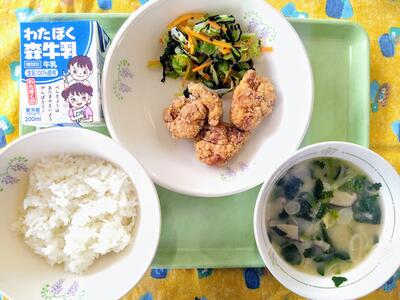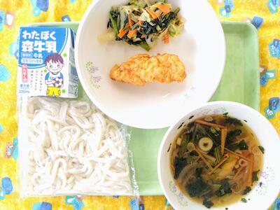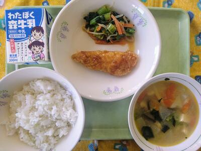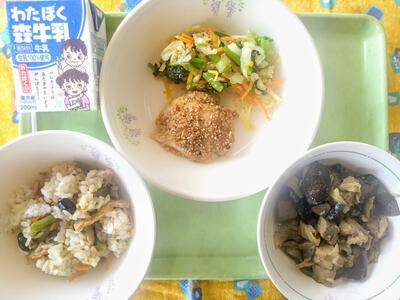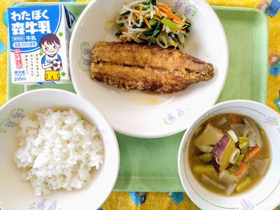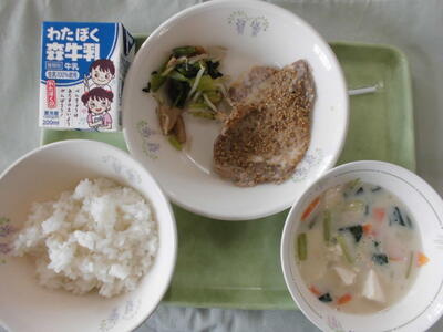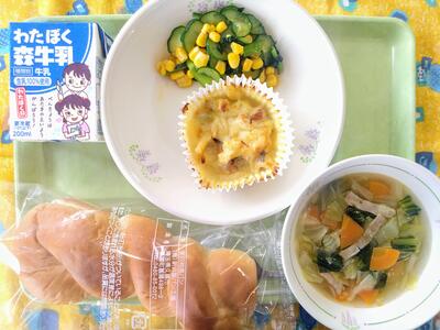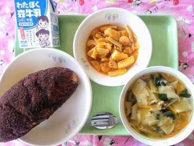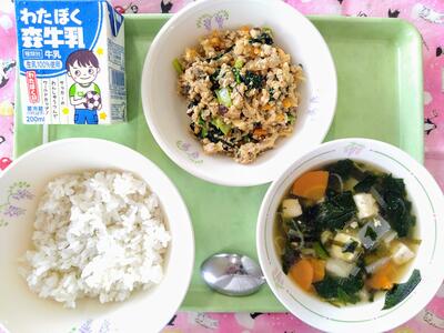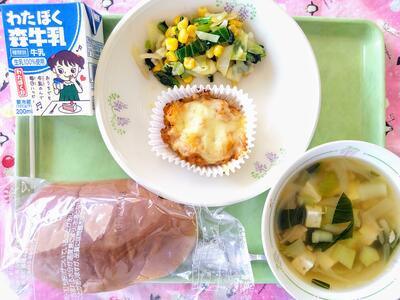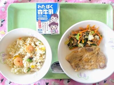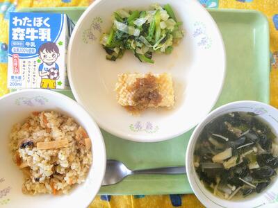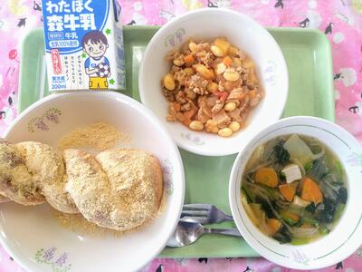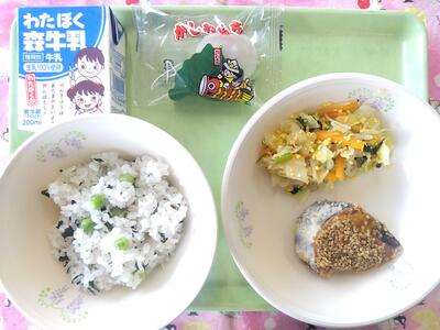 今朝は1年生がそら豆のさやをむいてくれました。調理員さんが鮮やかな緑色に茹でてくれました。