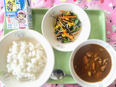 ※ごはんに使われている米は5年生が収穫したものです。地域の方のお力添えで、田植えから収穫まで体験させていただいています。たくさん収穫したので、給食で3回出る予定です。今日のごはんも調理員さんがおいしく炊いてくださいました。