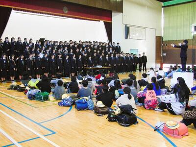 6年生は豊春中学校で1日入学体験・説明会に参加しました。最初に中学生が宮川小と豊春小の6年生及び保護者のみなさんに、すばらしい合唱を披露してくれました。中学生の歓迎と応援の気持ちが伝わるとともに、「合唱の豊春中」といわれる学校に進学する心の準備ができたと思います。合唱に続いて基本的な中学校生活についての説明もありました。その後、子どもたちは教室へ移動し、作文を書きました。