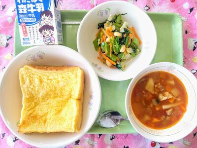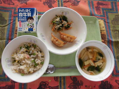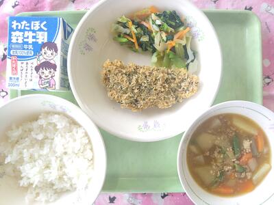 今朝は1年生がそら豆のさやをむいてくれました。調理員さんが鮮やかな緑色に茹でてくれました。