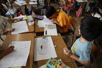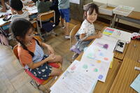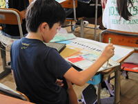 2年生はスイミーのさし絵をカラフルにプリントに描いていますね