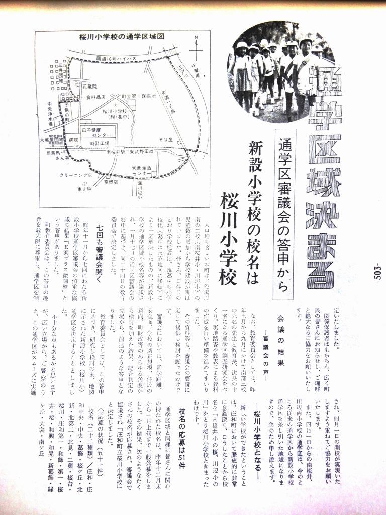 記事を読むと、桜川小にきまった由来や、桜川以外で候補に挙がった名前などのことが書いてあります。また初代校長の池上校長先生の学校紹介によれば、当時の児童数は925名、学級数25だったことがわかり感慨深いものがあります。