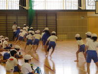 1年生の体力テストです。反復横跳びとちょう座体前屈を行っています。6年生がやり方のお手本を示したり、回数を数えてあげたりと一生懸命面倒をみてくれました。
