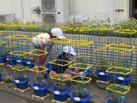 休み時間になると、たくさんの2年生が鉢植えしたミニトマトの様子を見に来ます。どの鉢も順調に育っているようです。