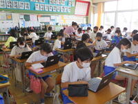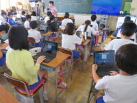 5月26日(水)、6年1組では総合的な学習の時間に、初めて自分のタブレットを手元に置き、授業を進めました。まずは、自分のタブレットに名札シールを貼り、IDやパスワードを入れ立ち上げる手順を確認。自分だけのタブレットに、笑顔がこぼれていました。
