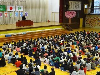 本日は新学期の始業式です。体育館に2~6年生が集まりました。新しい先生方の紹介や、校長先生のお話、児童を代表して6年生の感想発表、担任発表、生活目標のお話などがありました。