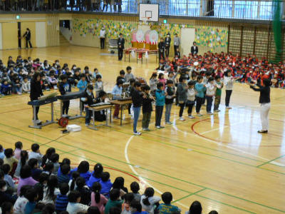 ↑ 6年生が、一年生を迎える歌や合奏、ダンスを披露しました。最高学年らしい立派な態度でした。無事に入学式が終了して、一年生は教室へ向かいました。