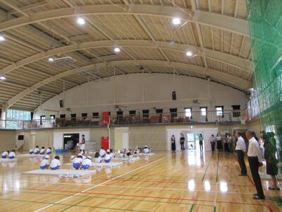 写真は体育館での5年1組マット運動の授業参観の様子です。