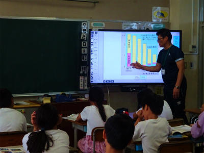 ↑ デジタル教科書を活用して、教科書のグラフを電子黒板に投影しています。瞬時に棒グラフが示されたりします。
