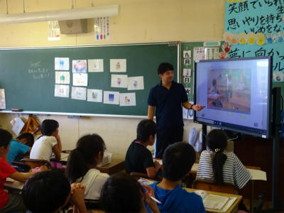 ↑ 外国語の授業では、タブレットの英語ソフトを電子黒板に投影しています。電子黒板から音声が流れたり、動画を視聴したりしています。