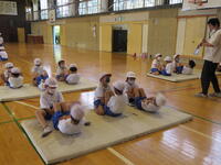 3年生が体育館で体力テストを行っています。写真は、上体起こしと反復横跳びを行っている様子です。1回でも回数を増やそうと、桜っ子は真剣に取り組んでいます。