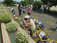 2年生は、先日植えたミニトマトの鉢に支柱を立てました。その後、土日の休みのことも考え、水をたっぷりあげました。