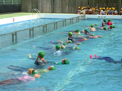 これは、万が一の水の事故などに備えて、着衣のまま泳ぐことの難しさを体験したり、ペットボトルなどを利用して水に浮く方法を学んだりする学習です。(写真は13日の金曜日の6年生の様子です)