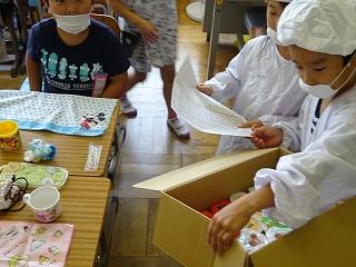 ↑ セレクトデザートなので、係さんが事前の注文のとおりに配ってくれました。本日の給食のメニューは、わかめごはん、ハンバーグ、夏野菜汁、彩り野菜のサラダ、牛乳、デザート、でした。