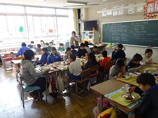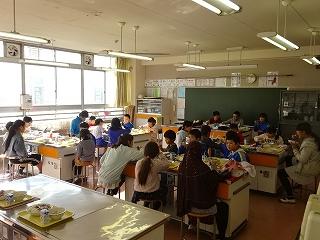 (↑ 給食の様子。班ごとに集まって、6年生中心に準備をしたり、楽しく話したりしながら会食しました。)