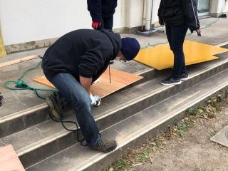 ジャンピングボードは子供たちが多く利用するので損傷が激しく、天板(ボード)やネジを補修していただきました。飛び箱の運搬台は、体育館で飛び箱を移動させるために下にキャスターがついた運搬台を4台、作っていただきました。