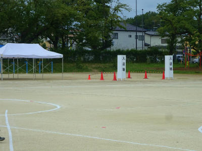 6:00 雨天判定→実施を決定。6:30 職員によって校庭の整備が始まっています。7:00 準備が進んでいます。8:30  児童が校庭に移動しています。8:45  入場行進が始まりました。