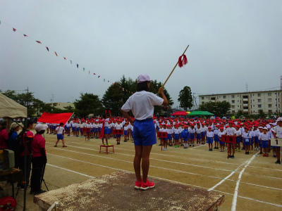 来週の土曜日が本校の運動会です。子供たちは毎日の練習に励んでいます。今日の朝は全校児童が、紅組と白組に分かれて応援合戦の練習をしています。