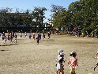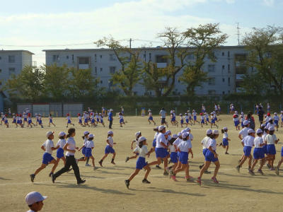 (↓ 本日の学校。朝のさわやかタイム。雨があがって校庭でマラソンができました。できました。明日も天気が心配ですが、学校内ではPTAの方が集まって明日のバザーの準備をしてくれています。)