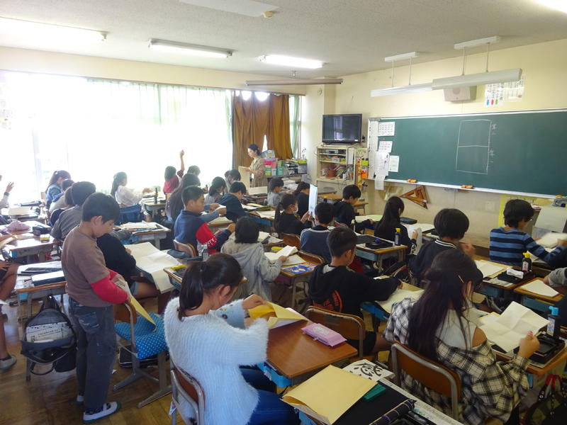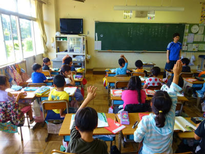 ↑ 先生の問いかけに一生懸命手を挙げて発表しています。発表する友達の意見もしっかり聞いています。
