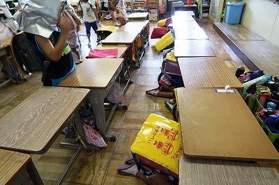 竜巻対応の避難訓練を行いました。竜巻接近の放送のあと机を使ってシェルターを作っています。1年生もてきぱきとつくることができ、目標タイムの5分をクリアしました。