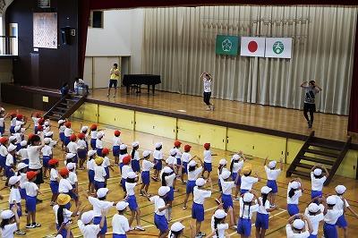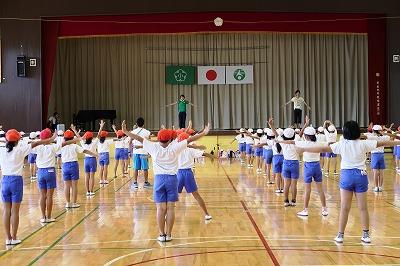 朝は、「桜っ子音頭」の練習です。ステージの先生の振りをみながら、踊ります。
