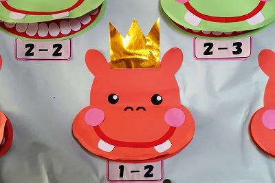 保健室前のカバさんの掲示についに金色の冠が一つつきました。1年2組です。