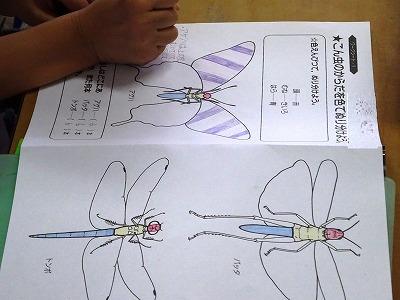 頭は「赤」、胸は「黄色」、腹は「青」ですね。どこが胸で腹かわからない子には、先生が「足はどこからはえているのかな?」とヒントを出しています。