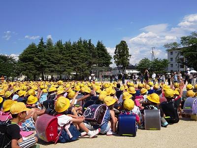 校庭に集合して開会式。ビブスを着ているのが大リーダーさんです。