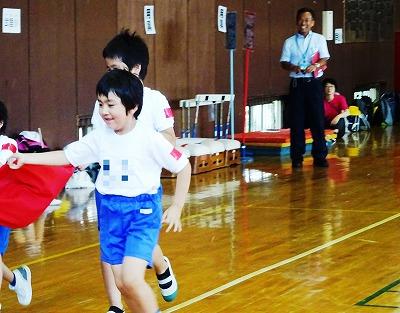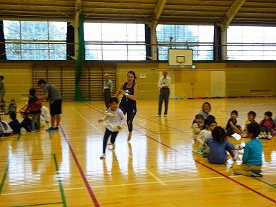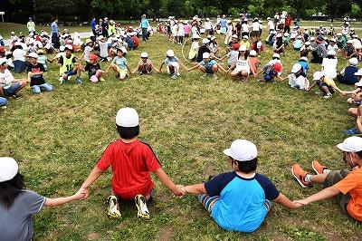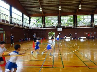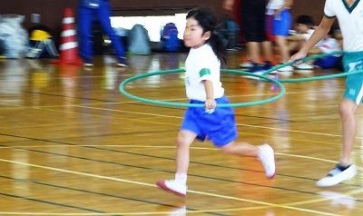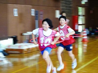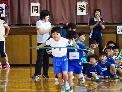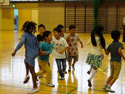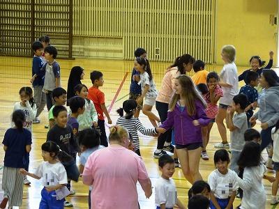 子どもたちは今日初めて出会ったにもかかわらず、すぐに仲良くなり、前半のミニ運動会では他校の友達と力を合わせてフラフープリレーやボール運びリレーに一生懸命取り組んでいました。体育館には友達を応援するかけ声が響きました。
