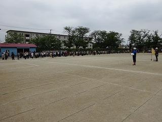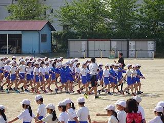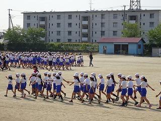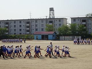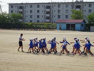 本日の朝は今年一回目の「さわやかタイム」です。全校児童が校庭に出て運動します。本日は、集団行動などに取り組みました。