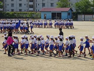 さわやかな日射しの中、子供たちが元気の行進しています。