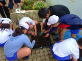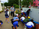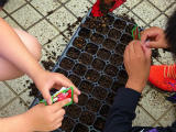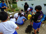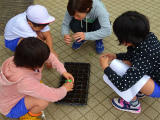 本日は委員会の活動日です。(下の写真は、いきもの委員会の活動の様子。種を植えて植物を育てます。)