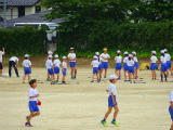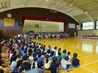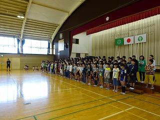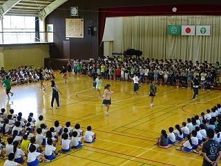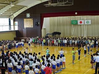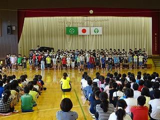 本日は、今週の木曜日に迫った陸上大会に向けて、選手の壮行会がありました。各種目の選手がデモンストレーション演技を披露し、会場の児童から大きな拍手を受けました。