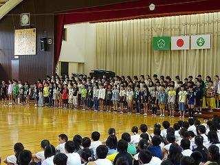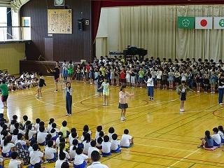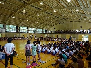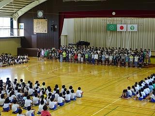 本日の朝は、体育館でプール開きの集会です。今日はプールには入りませんが、これから始まるプールの学習について、約束事や入り方を全員で確認しました。