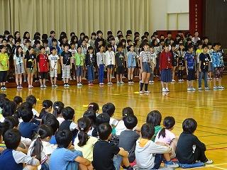 ↑ 6年生が、合唱・リコーダー演奏・リズム縄跳びなど交えて、4曲を発表しました。短時間での練習にもかかわらず、練習の成果を発揮して、下級生の手本となる立派な発表でした。