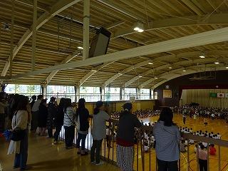 ↑ 児童の司会・進行で音楽朝会が始まりました。多くの保護者の方も参観に来校していただきました。