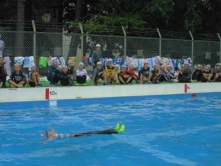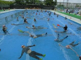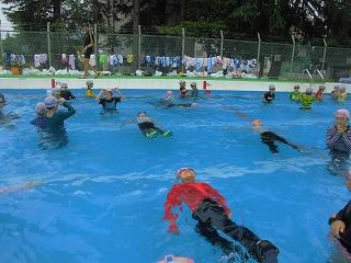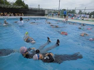 これは水の事故などの備え、着衣のまま泳ぐことの難しさを体験したり、ペットボトルを浮袋代わりに浮く練習をしたりすることで、自分の身を自分で守れる児童の育成を目指した訓練です。
