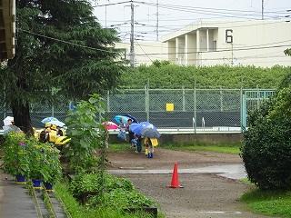 梅雨も明けないまま、雨の下校の様子です。子供たちが育てたアサガオやヒマワリは成長して、夏を感じさせませす。