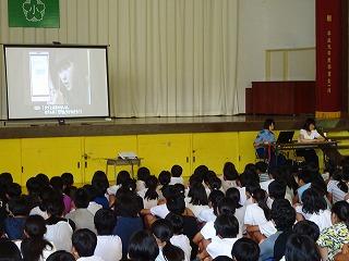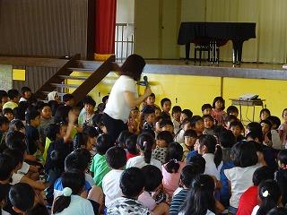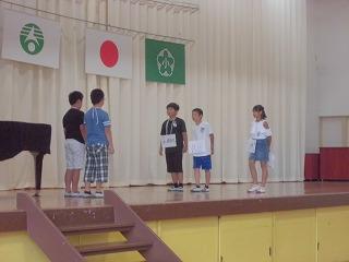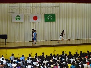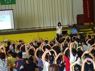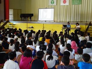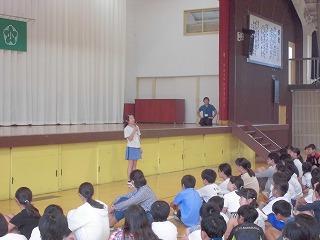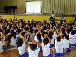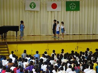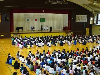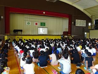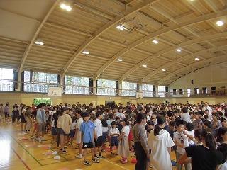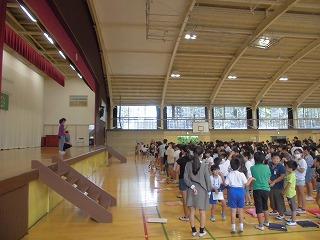 本日の朝は、体育館で児童集会です。集会委員が中心となって進めています。子供たちは縦割り班で集まって、班ごとにクイズに答えたりします。