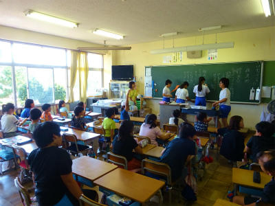 (↑ 1年生の算数の授業では、体積を比較してどちらが多いかをグループで話し合ったり、比べ方を考えたりしました。)