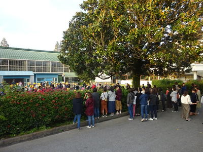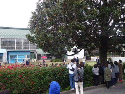 16;:01 バスが学校に到着しました。先生方や保護者の方が出迎えています。