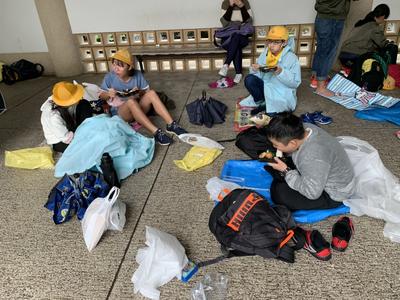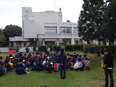 11:15 各グループごとに見学をしたり、チェックポイントを通過したりしています。雨の中ですが、どの班も楽しんで行動しているようです。