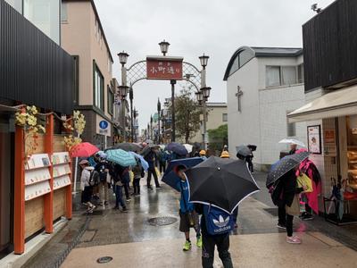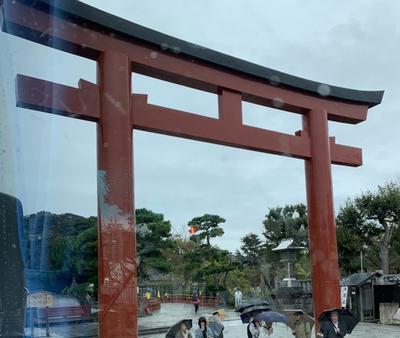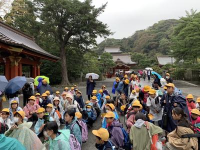 10:00 もうすぐ鶴岡八幡宮に到着します。少し雨が降っています。カッパを着用して行動します。