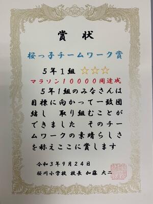 5年1組の皆さんが「桜っ子チームワーク賞」を受賞しました。この賞は、クラスの皆で一致団結し、目標を達成できたときに贈られる賞で、目標の達成が困難なほど☆の数が増えます。(最高は☆が3つ付きます)。4月からこれまでの期間、担任の先生を含め33名で合計10000周を達成するという頑張りを見せてくれました。得意な子も苦手な子も、お互い励まし合いながら、自分ができることに精一杯取り組んでいました。大変よく頑張りましたね。