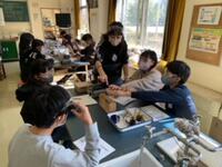 3年生の図工の授業の様子です。木材をのこぎりで切り、やすりをかけて表面を仕上げ、ボンドで色々な形につなげていきます。軍手を付け、安全に気を付けてのこぎりを使っています。のこぎりの使い方にもだいぶ慣れてきました。
