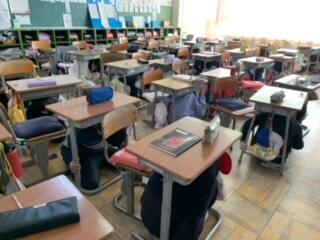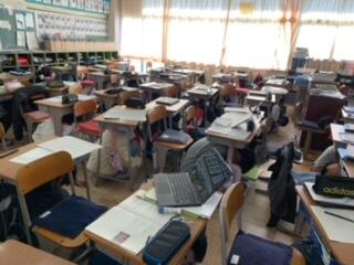 業間の休み時間を使って避難訓練を行いました。今回は、緊急放送を聞き、第一避難行動(机の下に身を隠す)、
