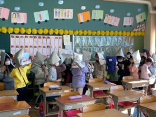 第二避難行動(防災頭巾をかぶり教室の後方に並ぶ)までを行いました。その後、担任が避難行動の留意点につ